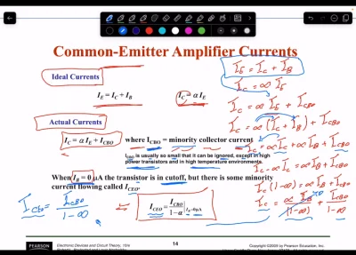 شرح كورس الالكترونيات لطلبة كليات الهندسة , حيث يشمل الفيديو شرح{ Common Emitter Amplifier Currents} ونقوم باستنتاج قانون كلا من تيار المجمع وتيار القاعدة وتيار الباعث وكذلك القانون الذى يربطهم معا وذلك فى حالتين التيار المثالى والحقيقي , ومن ثم نقوم بايجاد قانون معاملا التكبير ألفا وبيتا فى كلا التيار المستمر( AC) والتيار المتردد(DC) , ومن ثم نقوم بشرح {Common Collector Configuration } وشرح التمثيل البيانى له والذى يسمىCharacteristics الخاص به , وكذلك نقوم بشرح power Dissipation وذلك لكل من Common base و Common Emitter و Common Collector .